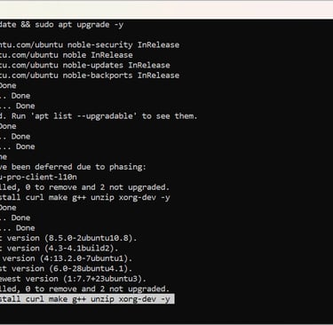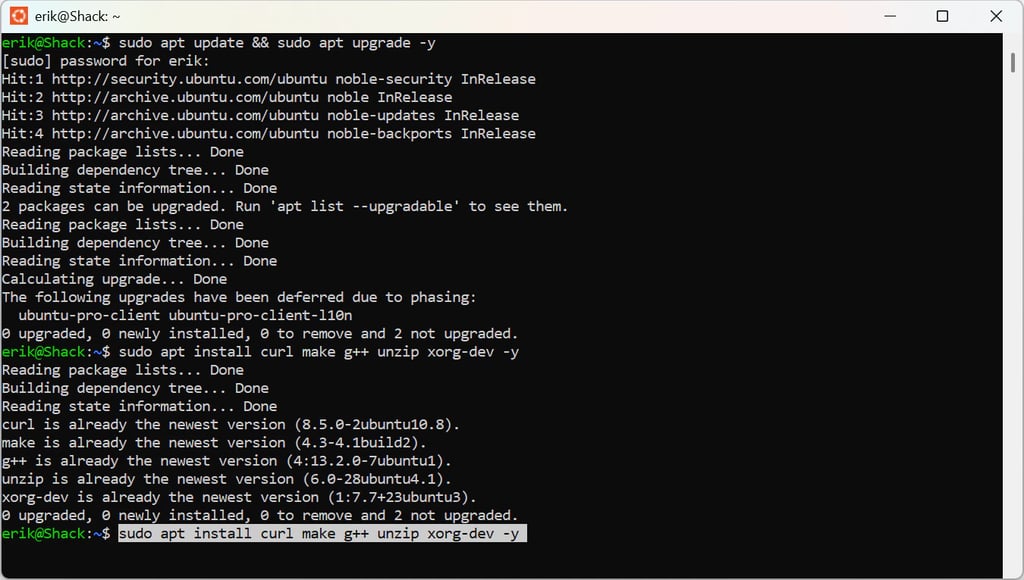In the Linux Terminal, enter sudo apt update && sudo apt upgrade -y followed by sudo apt install curl make g++ unzip xorg-dev -y