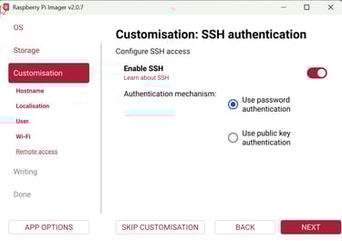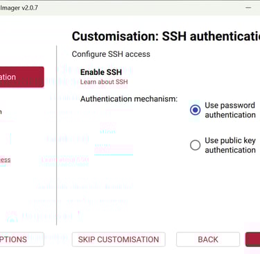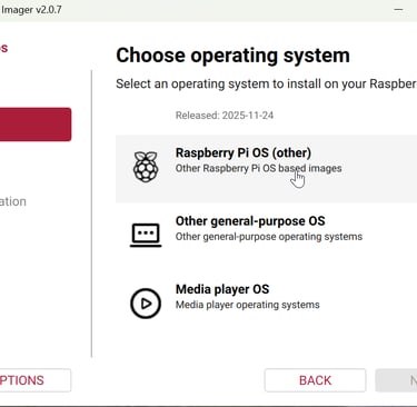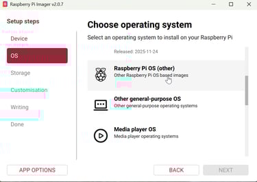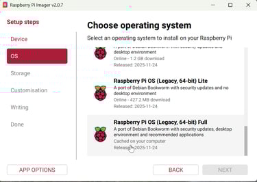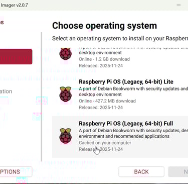 From scratch, open Raspberry Pi Imager and select your device. Next choose OS, Bookworm 64-bit Full is best. Enable SSH.