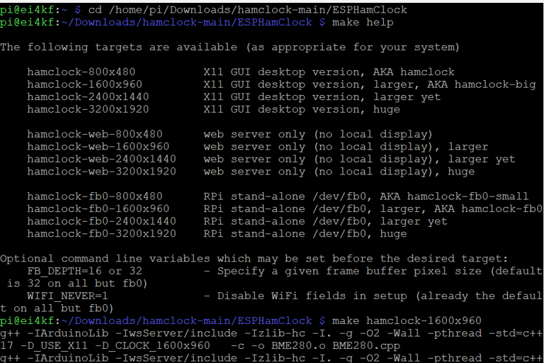 Next is the make hamclock-1600x960 command (or whatever size suits your screen), followed by sudo make install